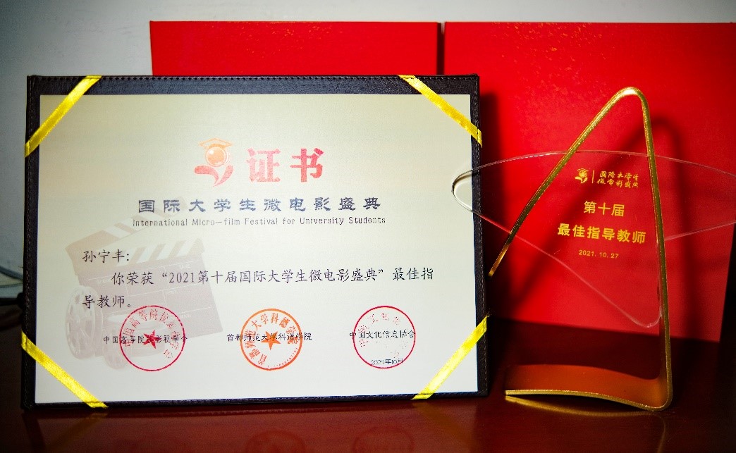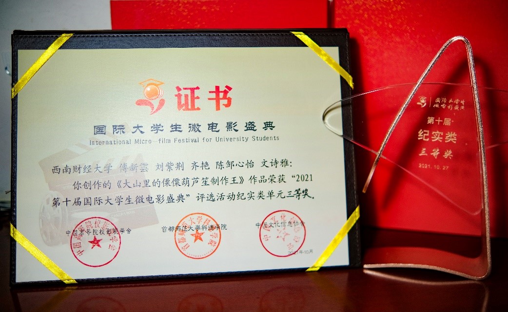 2021年12月6日,为了响应国家防疫的要求,备受影视传媒高校师生和行业关注的第十届国际大学生微电影盛典在京视网上首次以“线上”的形式开展,直播现场揭晓了第十届国际大学生微电影盛典全部获奖榜单,由我院研究生傅新雲、刘紫荆、齐艳、陈邹心怡、文诗雅等五位同学创作的纪录片《大山里的傈僳葫芦笙制作王》获纪实类三等奖,我院教师孙宁丰获评“最佳指导教师”。