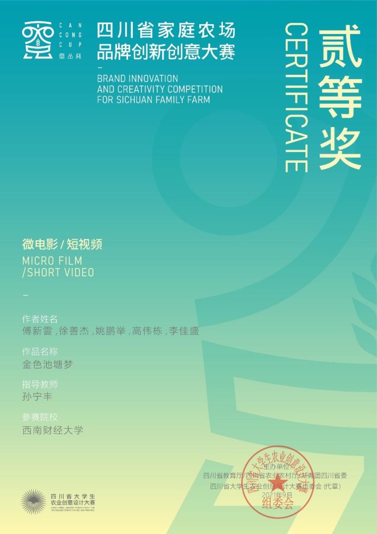 此外,由我院新闻与传播专业硕士傅新雲、徐善杰、高伟栋、李佳盛、姚鹏举五位同学制作、学院教师孙宁丰指导的微电影《金色池塘梦》在“蚕丛杯”四川省家庭农场品牌创新创意大赛中斩获“二等奖”。