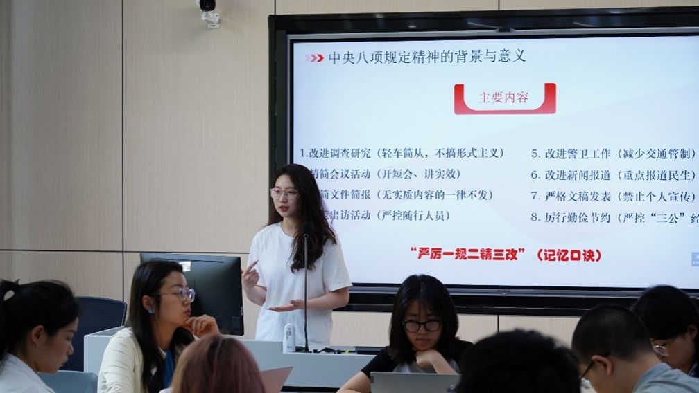 随后,经济与管理研究院2024级硕士党支部书记冉珊以《金融廉洁的底线与红线——从中央八项规定看行业作风建设》为题作微党课。冉珊结合金融行业特点,由浅入深地分析了中央八项规定精神与金融廉洁的关系,通过典型案例讲解了金融领域廉洁风险的主要表现,并希望大家提高认识、查摆问题、检视不足,不折不扣地贯彻中央八项规定精神。