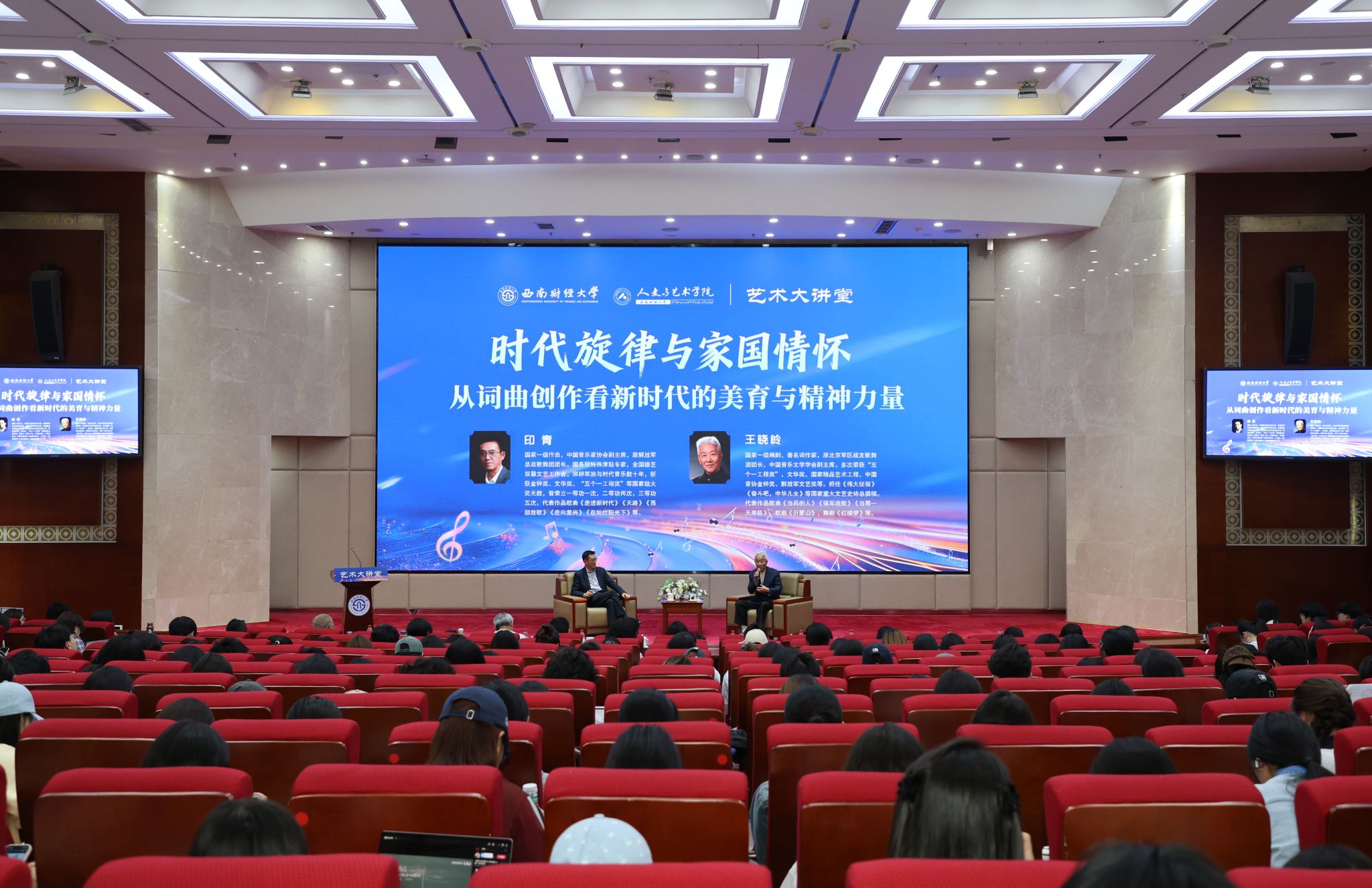 4月26日,西财艺术大讲堂在学校弘远楼105会议室举办。著名作曲家印青、词作家王晓岭以“时代旋律与家国情怀:从词曲创作看新时代的美育与精神力量”为主题讲授。学校党委书记赵建军出席,党委副书记、纪委书记孙殿明主持讲座。