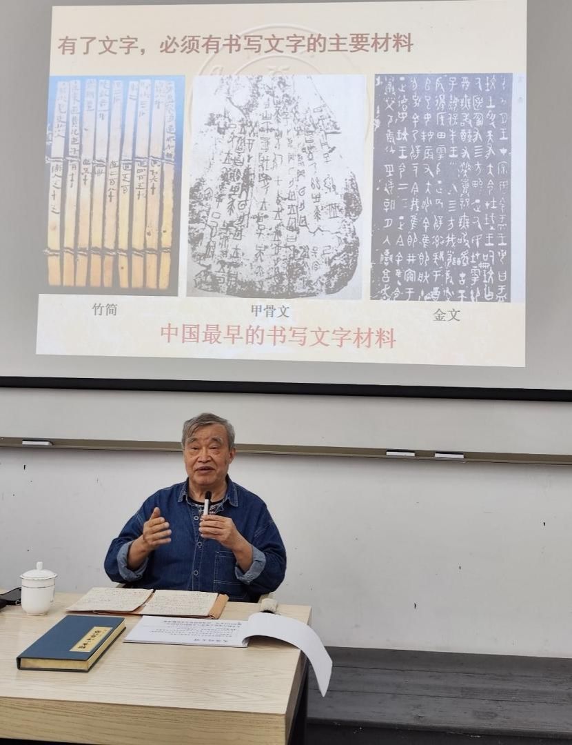 讲座伊始,叶俊老师从侯开嘉教授“一生只做三件事”的自谦词展开,对其在书法创作、学术研究以及书法教育三方面取得的成就进行了介绍。在随后的讲座中,侯老师首先从文字的出现是人类进入文明时代的标志这一视角出发,探讨了文字的出现与书写材料的关系。在对中国早期的文字书写材料——甲骨文、金文和竹简进行了一番考究之后,侯老师揭示了竹简后来在很长一段历史时间之内成为汉字的主要书写材料的原因,即从竹简材料的普遍性、制作工艺的简易性、书写和保存的方便性以及制作竹简的工具成熟性四个方面展开了论述。