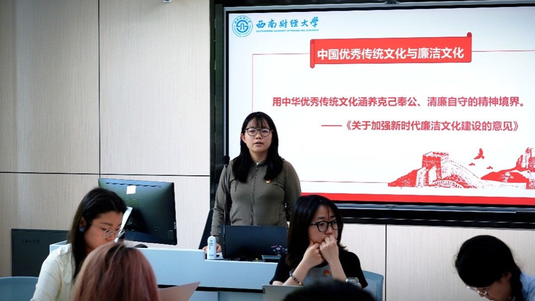 随后,经济与管理研究院2024级硕士党支部书记冉珊以《金融廉洁的底线与红线——从中央八项规定看行业作风建设》为题作微党课。冉珊结合金融行业特点,由浅入深地分析了中央八项规定精神与金融廉洁的关系,通过典型案例讲解了金融领域廉洁风险的主要表现,并希望大家提高认识、查摆问题、检视不足,不折不扣地贯彻中央八项规定精神。